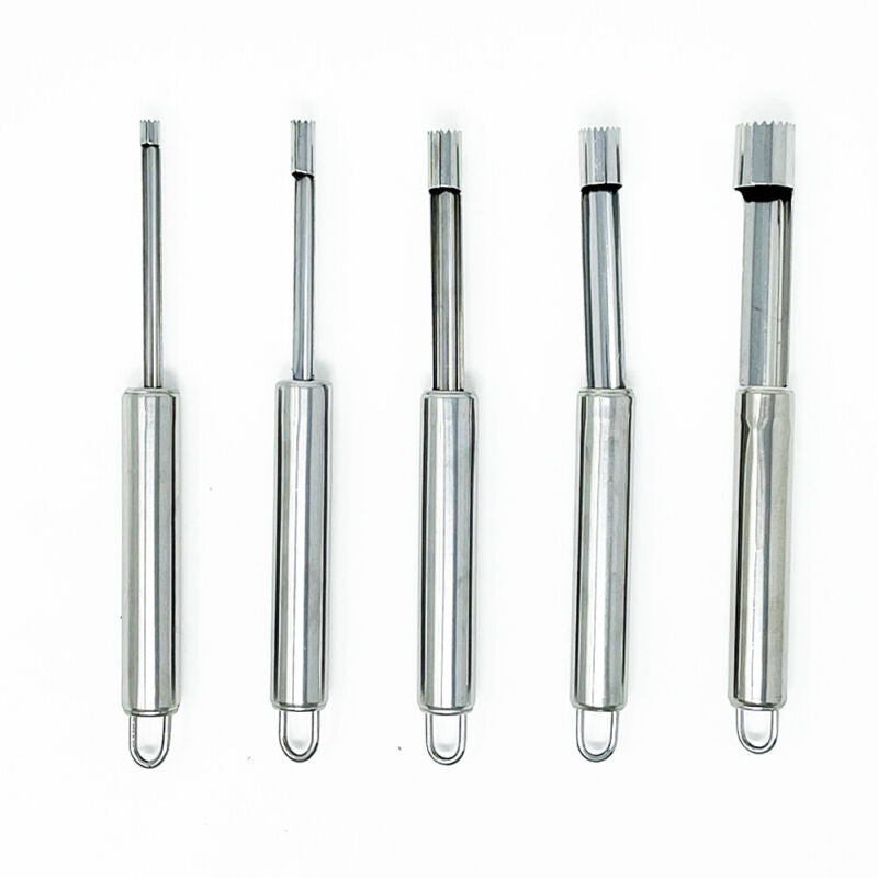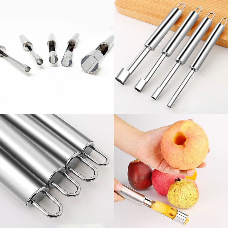 Multi-function - 5 size hand-held corer, ideal to get rid of many size fruits pits in seconds. Core diameters are 0.25 inches, 0.31 inches, 0.39 inches, 0.5 inches and 0.72 inches. Core length is 7.72 inches, 7.8 inches, 7.89 inches, 7.99 inches, 7.99 inches. Perfect for handling apple, pear, cherry, jujube, red dates, etc. (Find out more detail in product photos)