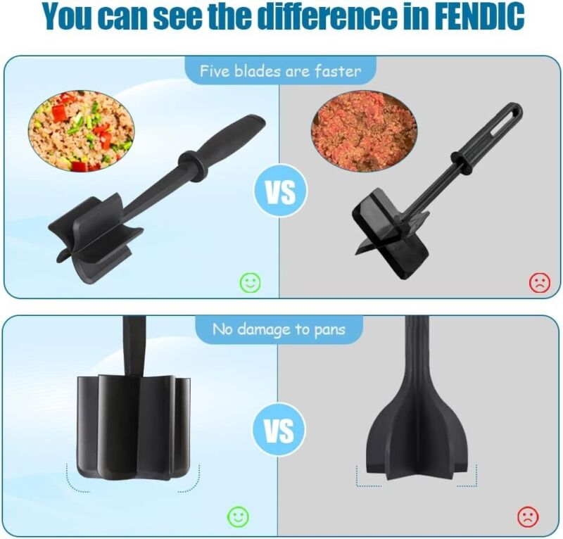• Must have chopper tool - 5 beveled pinwheel blades of meat chopper makes it easier to chop and crumble food, which will effectively break up ground meat and turkey for burgers and tacos, mash eggs, potatoes, squash, avocados, etc. Also ideal for stirring sauce and purees.
