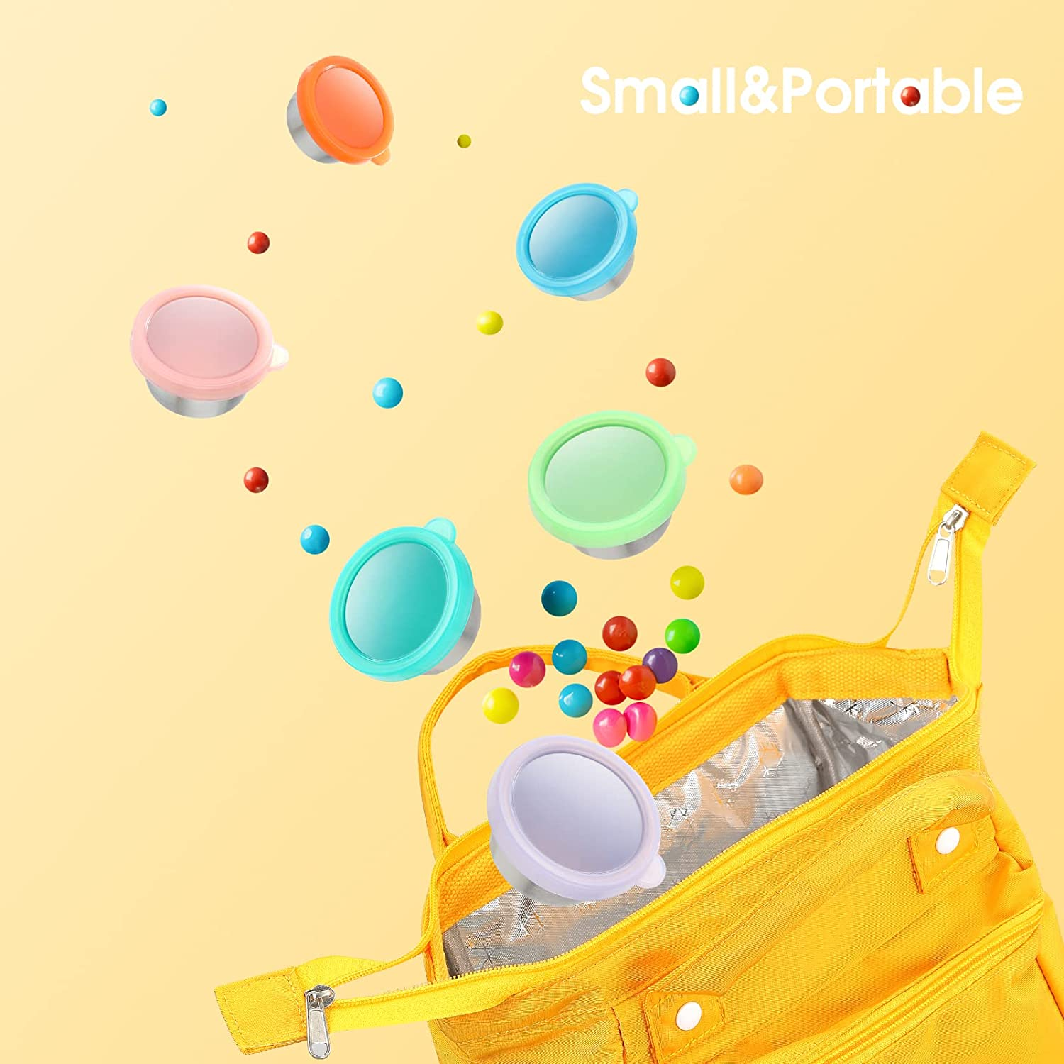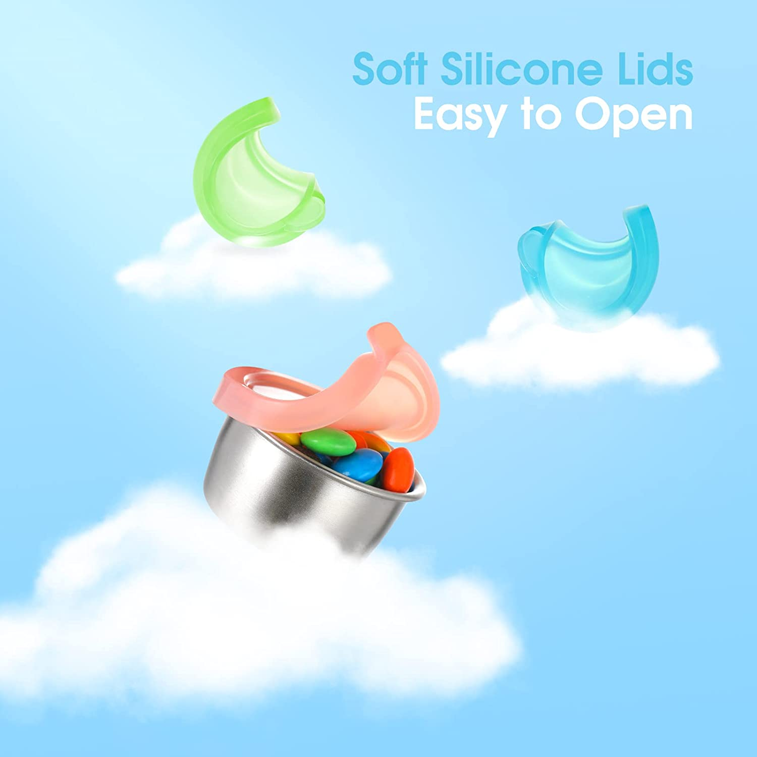 Easy Open Colorful Lids- The combination of the soft silicone lid and the handle is not only cute but also very easy for children to open. The rainbow color translucent lid is stylish and can also be used to distinguish the different sauces in the container. The colorful set can meet the various preferences of adults and children.