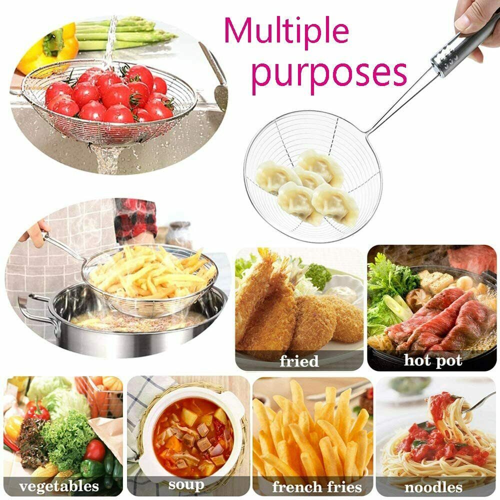 The concave net catches food securely while releasing oil and and other residue, perfect for frying foods, like potato chips, chicken legs, and scoop up noodles, Speatzle, Spaghetti and more.
