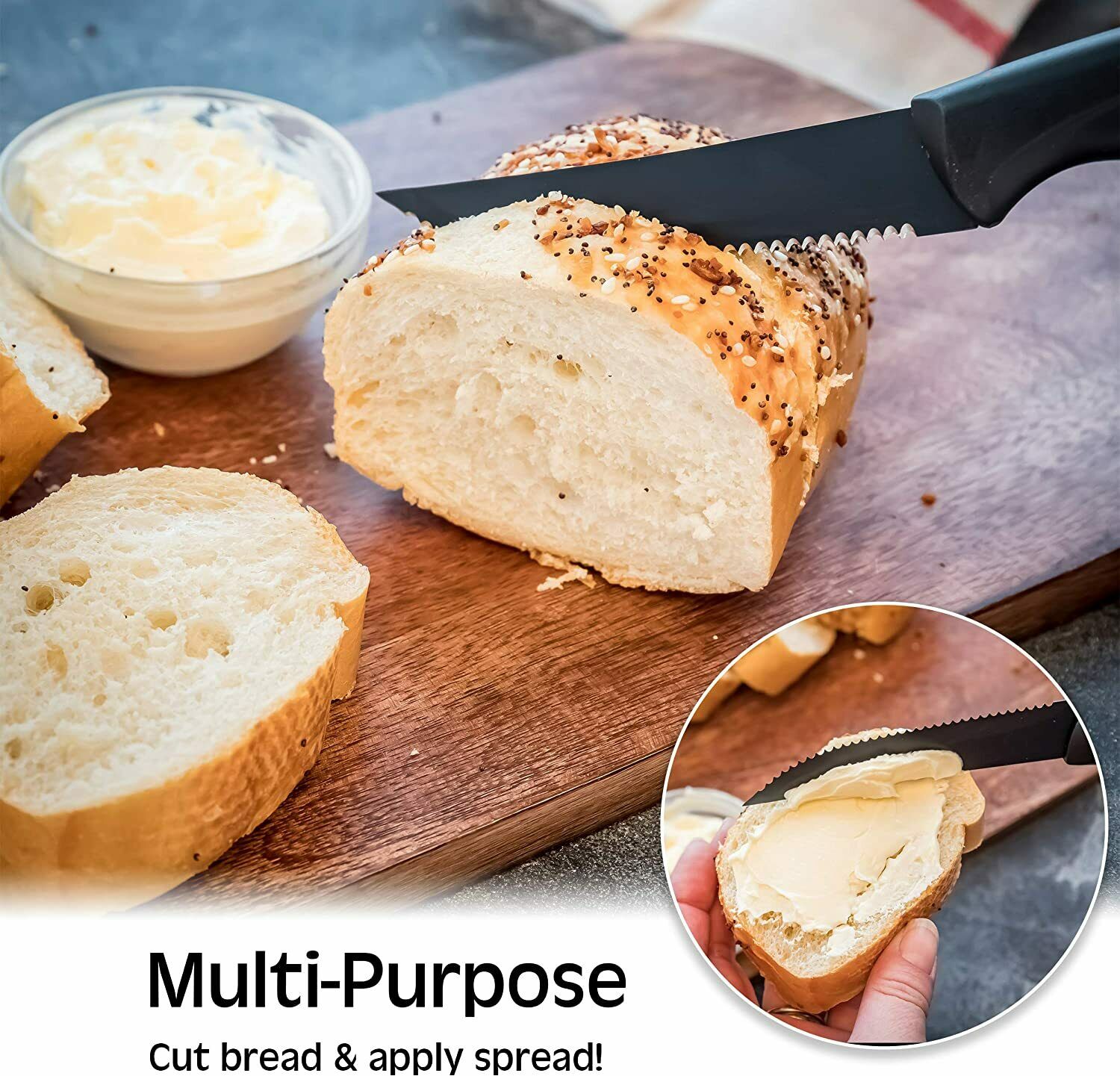 - 8-Piece Premium Steak Knife Set consists of fully serrated and sharp knives made of high quality stainless steel blades that cut effortlessly through meat.