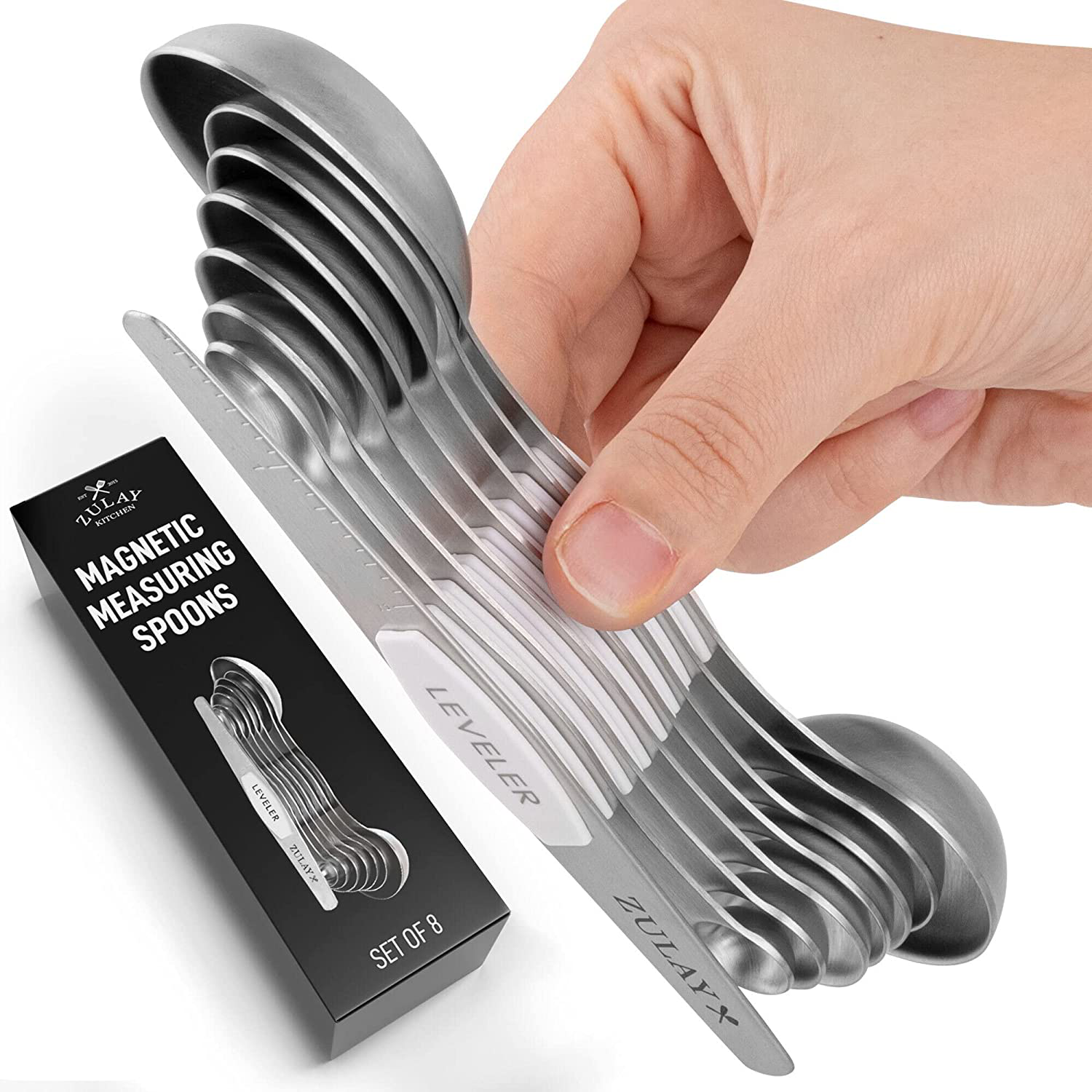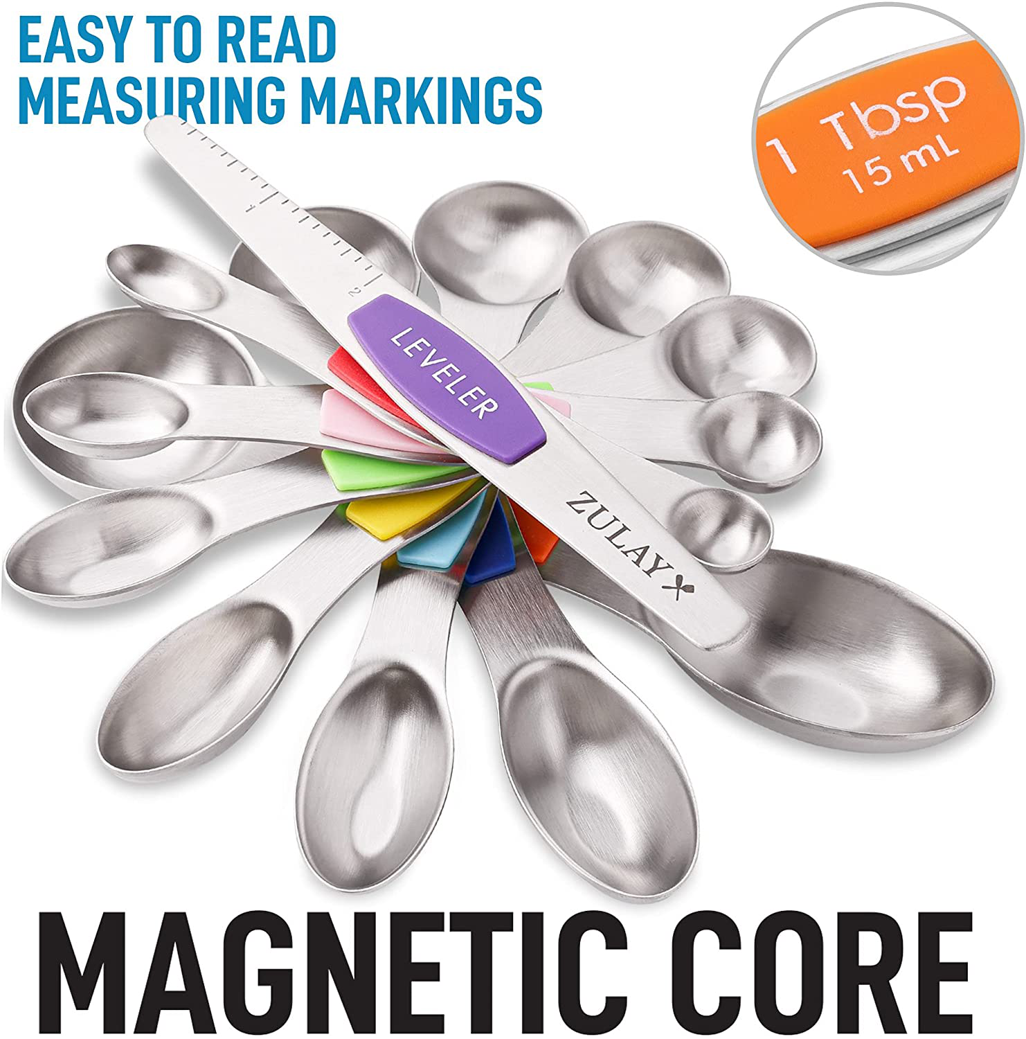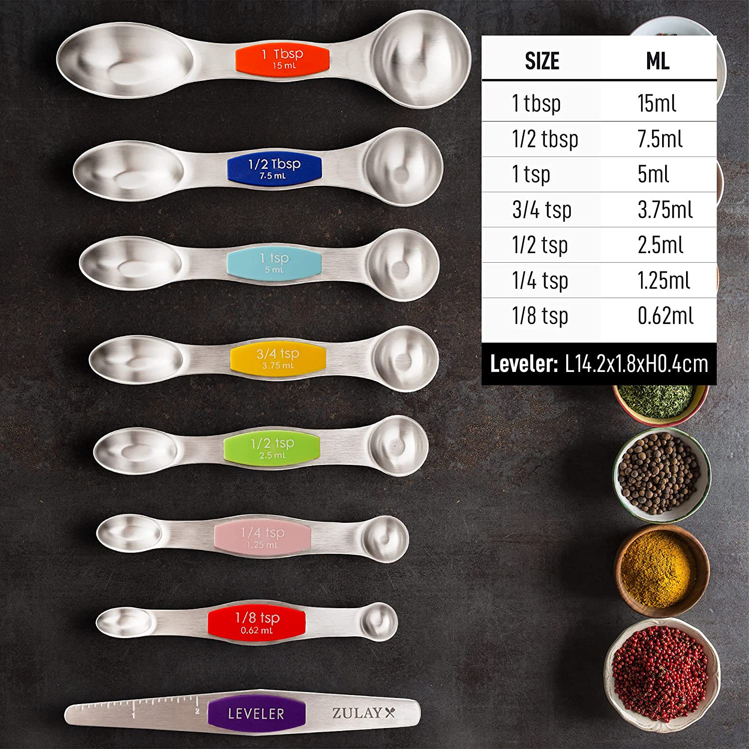Accurate Magnetic Measuring Spoon Set: Comes with seven double-headed spoons and a leveler. Labeled with large and clear US metric measurement markings that won’t fade or rip off. Sizes vary from: 1/8 tsp, 1/4 tsp, 1/2 tsp, 3/4 tsp, 1 tsp, 1/2 Tbsp, and 1 Tbsp plus 1 leveler.
