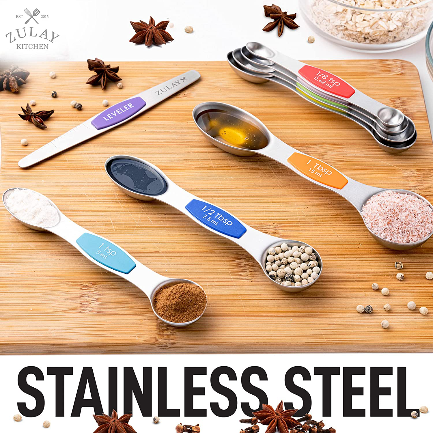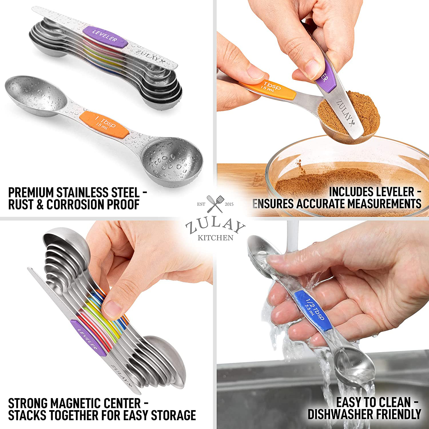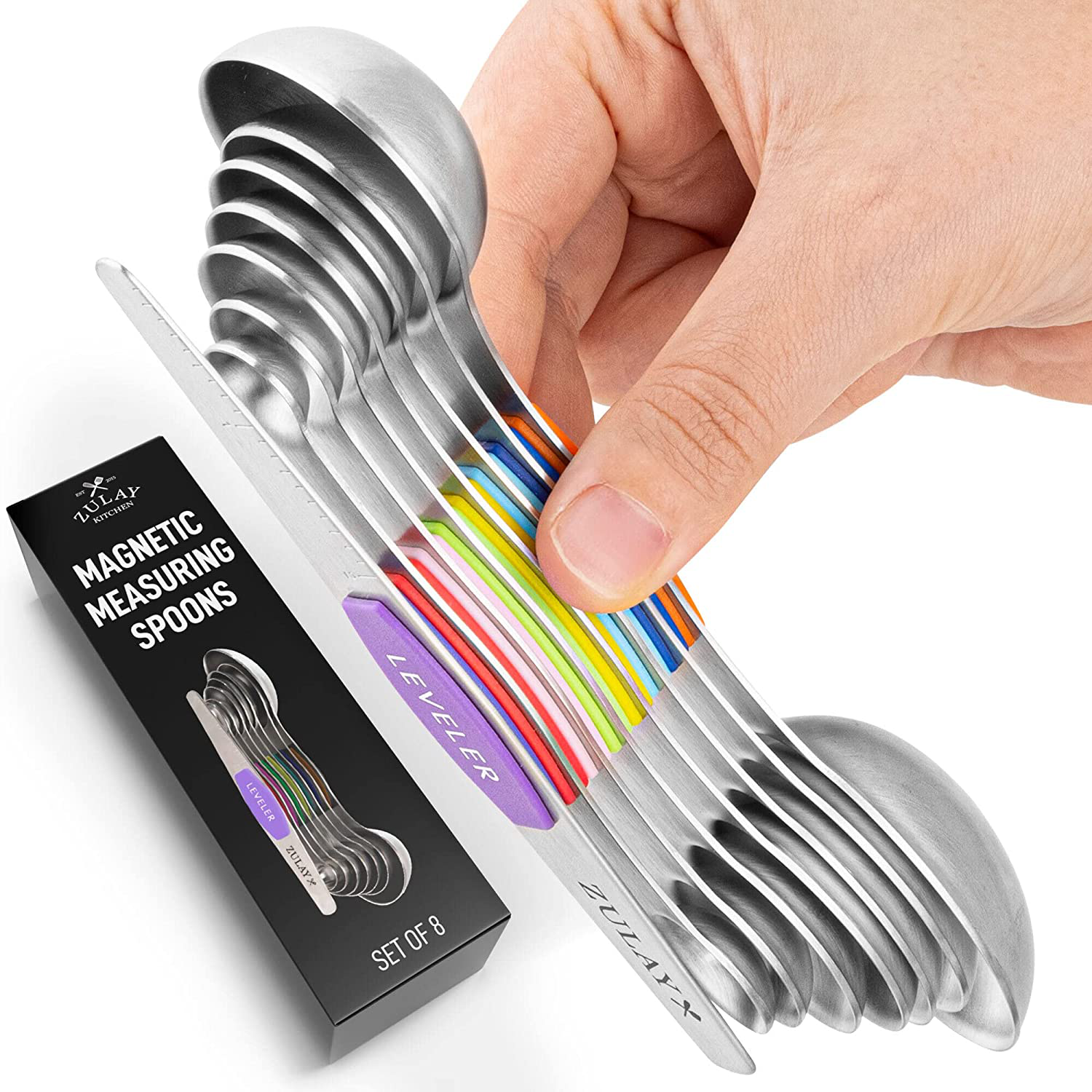 Accurate Magnetic Measuring Spoon Set: Comes with seven double-headed spoons and a leveler. Labeled with large and clear US metric measurement markings that won’t fade or rip off. Sizes vary from: 1/8 tsp, 1/4 tsp, 1/2 tsp, 3/4 tsp, 1 tsp, 1/2 Tbsp, and 1 Tbsp plus 1 leveler.