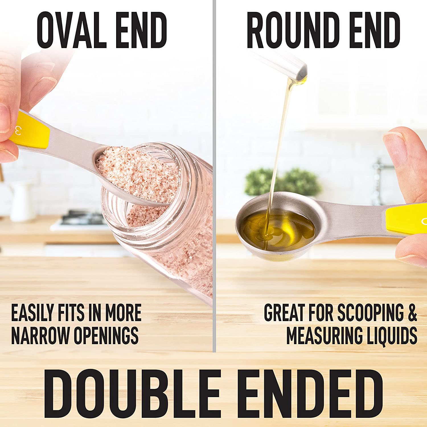 Dual Sided Design: Features an oval-headed side with slim design that fits in narrow jars ideal for scooping dry ingredients; the rounded head is handy for measuring liquid ingredients.. Note: Each spoon has the exact same measurement of its opposite side.