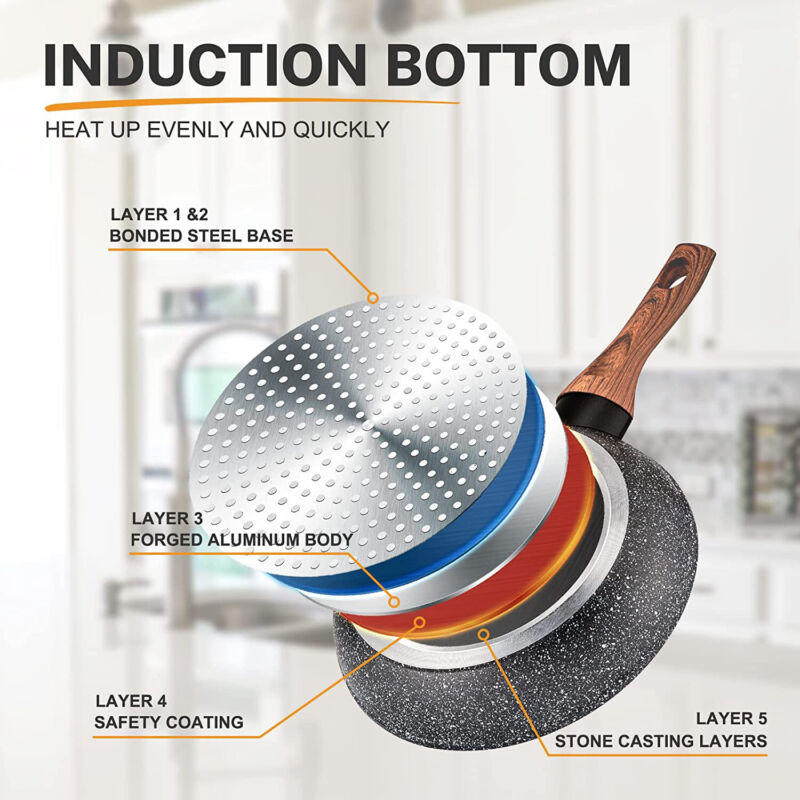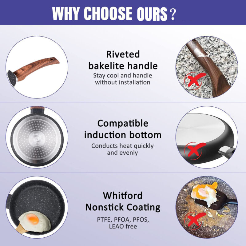Toxin-free Cooking Set -When buying a new set, make sure that it clearly indicates that it is lead, PFOS, PFOA-free. These are the three things that you don't want to have in your cookware because of their potential health dangers. Fortunately, you can get granite cookware that is free of these harmful chemicals. For more health & Eco-friendly.