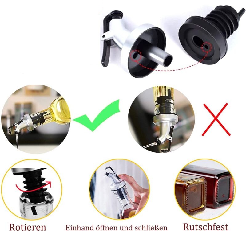 Made from high quality glass, featuring a crystal clear enclosure, airtight bottle stoppers, and pouring spouts with lever-release snap lids.