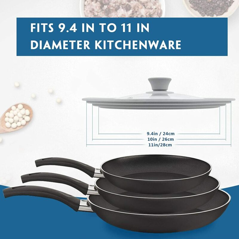 MULTIPURPOSE SIZE: The tempered glass lid fits perfectly for a pot of 9.4 i24cm) 10 in(26cm), and 11 in(28cm) diameters, also fits for pot or pan from 8.7 inches to 11.4 inches diameters. You can choose to fit your needs. Works with fry pans, pots, saucepans, skillets, stockpots, woks, round bowls, cast iron pans, and practically any other style of cookware.